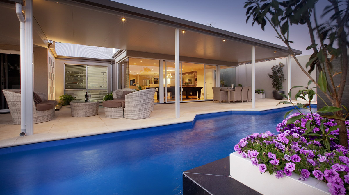 Poured limestone covers the surrounds of the pool area with a 80mm-thick bullnose paver as a coping edge to the pool.